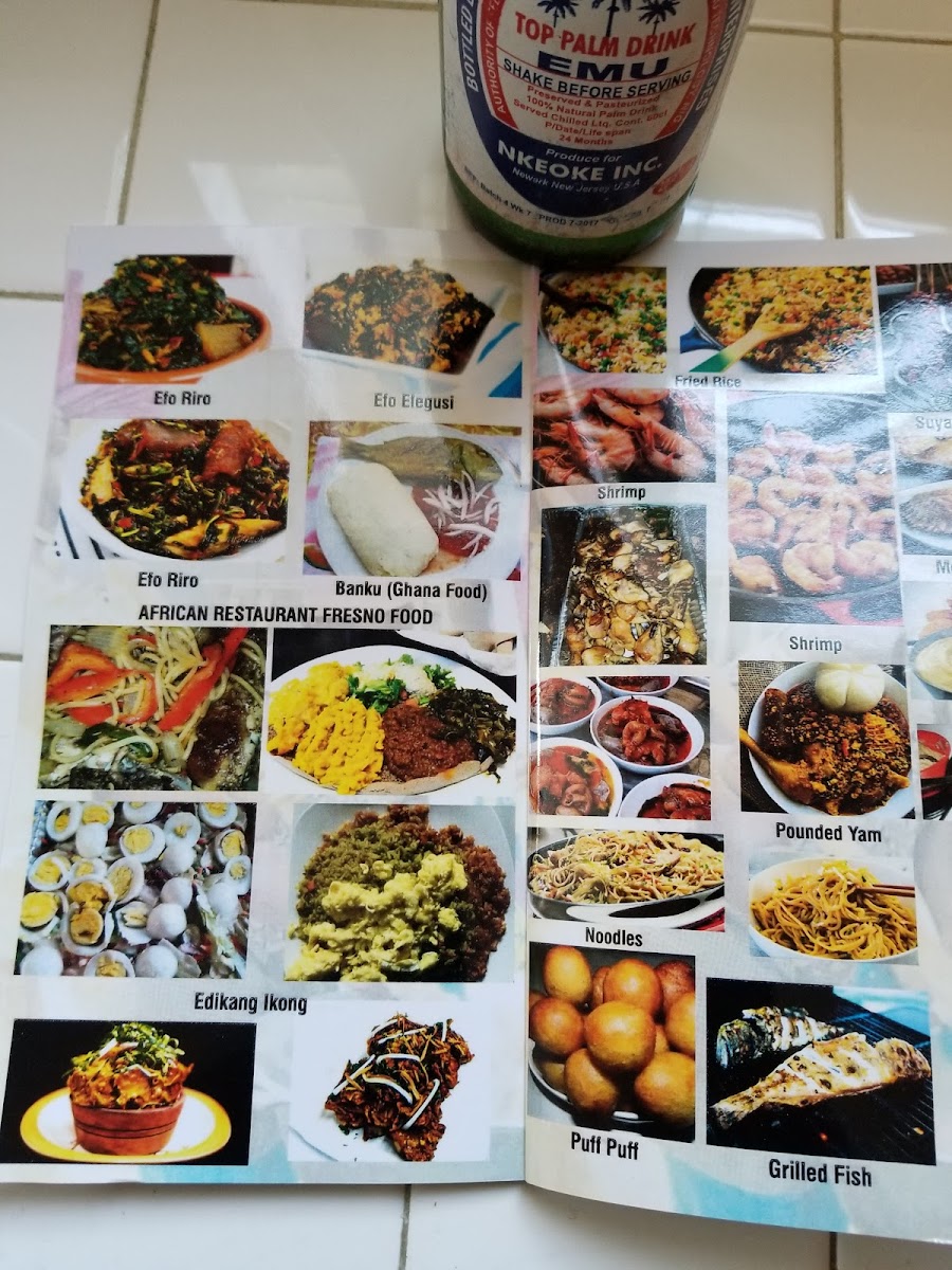 Talk about a hidden gem!!!! You have got to try this! Just don’t be in a rush, this is home cooking not fast food fare. John cooked the most delicious savory food! I had the jollof rice with spicy goat meat and pounded yam with ogbono also with spicy goat meat. Everything was made fresh and came out piping hot. Drinks are bottled beverages you self serve from the fridge and they charge you for at the end of your meal. It’s also a shop that carries staple goods African cooking spices and iyan (powdered yam) Nigerian snacks like chin chin and palm drink (fermented palm wine) Definitely eating here every time I come Fresno. They also do catering!!!